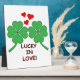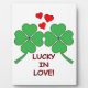 Drawings of four-leaf clovers with heart shapes floating over them.