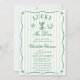 This design features soft vertical green stripes, graceful scalloped borders, and iconic lucky motifs including a four-leaf clover, horseshoe, and martini glass—symbolizing good fortune, love, and celebration. The elegant script and serif typography combination creates a polished look that’s ideal for garden bridal showers, spring brunches, country club events, outdoor luncheons, or Irish-inspired celebrations.