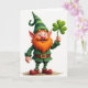 This card shows a cheerful leprechaun centered on a bright white background, drawn with rounded, almost clay-like depth. He wears an emerald-green tunic with a golden belt buckle, striped stockings, and chunky red shoes, topped with a tall, curled green hat that rises above his head. His orange beard is full and textured, and his bright blue eyes and rosy cheeks give him a friendly, inviting look, like he’s smiling at someone just off to the side. In one raised hand, he holds a green four-leaf clover ☘️, angled outward as if offering it to a close friend. The lighting is soft and even, shaping the curves of his face, hat, and clothing without harsh shadows. A short St. Patrick’s Day greeting appears near the top in green lettering, with a smaller line of text beneath it in a lighter shade, leaving the character unobstructed 💚. The hat’s curled tip arcs upward in layered greens, and the clover’s four leaves show clear veins against the white space.