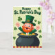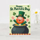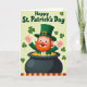 This greeting card features a cheerful leprechaun centered in the scene, rising up from a dark pot filled to the brim with gold coins, as if he’s greeting a close friend with open arms 💚. His face is bright and friendly, with rosy cheeks and a thick orange beard that draws your eye right away. He wears a rich green top hat and matching jacket, finished with a shiny golden buckle that catches the light. Gold coins spill over the rim of the pot, adding warm yellow highlights that make the middle of the card feel lively and inviting. The background is a soft pale lime green, sprinkled with darker green four-leaf clovers drifting around like confetti ☘️. Across the top, the phrase “Happy St. Patrick’s Day” arches in bold lettering, standing out clearly against the light background. The clovers are scattered across the open space behind him, with the pot and coins anchoring the lower center of the design.