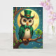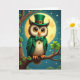 This greeting card features an adorable owl dressed for St. Patrick’s Day, wearing an emerald-green top hat with a golden buckle, a matching jacket, and a neat bow tie. Its golden-amber eyes shine against soft brown and creamy white feathers, giving it a tender, friendly look as if it’s quietly keeping someone special company 💚. The owl sits calmly on a textured tree branch dotted with bright green shamrocks, with a small three-leaf clover pinned to its lapel. Behind it, a large full moon glows in pale yellow, and faint shamrock shapes appear across the moon’s surface like soft shadows. The night sky is a deep twilight blue sprinkled with tiny white stars, while hints of leafy green foliage frame the lower edge ☘️. St. Patrick’s Day text is placed near the top in light lettering that stands out against the dark sky, with smaller matching words tucked near the bottom for balance. The owl’s hat buckle gleams in warm gold, and the branch bark shows rugged lines and speckled highlights beneath the scattered shamrocks.