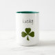 Lucky Shamrock St. Patrick's Day coffee mug, with a green clover shamrock. Black lettering can be customised with your own text.