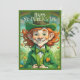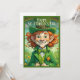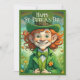 🍀A cheerful young girl dressed as a leprechaun beams with excitement, holding a beautifully wrapped golden gift. She wears a vibrant green outfit, complete with a top hat adorned with shamrocks, a bow tie, and golden buttons. The background captures a festive city scene with confetti in the air, enhancing the joyful spirit of St. Patrick’s Day. The image radiates luck, happiness, and celebration.✨