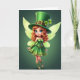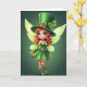 This card features a leprechaun-fairy sprite centered on a deep emerald background, bringing a friendly St. Patrick’s Day mood to the scene 💚. She stands in a light step with arms gently open, like she’s greeting a close friend with an easy, affectionate welcome. A tall green top hat with a gold buckle and two shamrocks sits above curled auburn hair that spills down in soft ringlets. Her bright blue eyes and rosy cheeks pair with a small, knowing smile that feels like a shared secret ☘️. She wears a strapless green dress with gold lacing and trim, flowing into a ruffled skirt that adds movement around her knees. Mid-calf green boots detailed with gold scrollwork and slim sleeves finish the outfit, while translucent lime-green wings spread behind her with a faint glow. The greeting text sits near the top in light gold lettering against the dark green field, and the wings fade outward in pale lime tones behind her shoulders.
