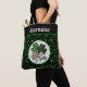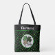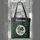 This fun monogrammed shamrock tote bag is great for Saint Patrick's Day, a gift an Irish friend, or for anyone who likes lucky shamrock themes. It includes three shamrocks with varying prints, including a primarily green print, a black print, and a "big cat" leopard animal pint, in a circle of white. The background is a pattern of green shamrocks against black, with green trim. Your monogram name appears at top in a vintage white typeface against black so make sure to type the name you want. The design is on both sides of the tote bag.