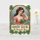 Designed with a vintage St. Patrick’s Day look, the card centers on a fair-skinned woman posed inside an ornate gold oval frame, meeting your eye with a gentle, inviting gaze that feels like a quiet hello from a close friend 💚. Her dark wavy hair falls around her face, and a bright red flower tucked near the curls adds a romantic accent against her rosy cheeks and coral lips. One hand, with red-polished nails, rests near her chin as if she’s mid-thought, giving the portrait a tender, intimate pause. She wears a blush-pink gown trimmed with soft white ruffles at the neckline and sleeves, and a rich green shamrock sits on her chest like a keepsake pinned there on purpose ☘️. Above the frame, larger four-leaf clovers balance the top of the design, while the lower border is dotted with smaller shamrocks and tiny blue flowers that trail along the bottom edge. The message appears on a decorative banner, with “GREETINGS GOOD LUCK St. Patrick’s Day” set in classic lettering that reads clearly against the ornate shapes. Gold detailing outlines the frame and banner, while greens, reds, and touches of blue stand out across the clovers, flower, and border accents.