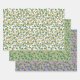 This festive "Lucky You" Shamrock Wrapping Paper Set features gold shamrock coins and clovers hand-drawn in black ink. The set includes three sheets featuring white, green, and purple backgrounds.