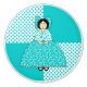 A cute doll named Lucy on a aqua and white polka dot background.