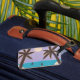 This luggage Tag with an identification insert is designed with a paper art depiction of silhouetted palm trees and a lavender sky.