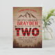 A lumberjack themed second birthday invitation with a warm wood background and a whimsical mountain silhouette. The word 'Two' is done in a colourful buffalo plaid and adds a fun pop of colour. We can customise this to any age, just ask :)