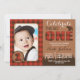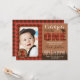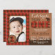 Celebrate the big ONE with this cute red and brown buffalo plaid lumberjack first birthday photo invitation. Cute heart on bear detail. Easy to customise design, add your little one's photo and your custom text.