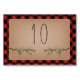 A wedding table number place card featuring an illustration of evergreen tree branches over a red and black plaid and cardstock inspired background.