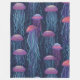 Luminescent jellyfish on a dark blue background is the perfect Ocean design for a bedspread. Neon gleaming jellyfish. With arched tentacles that float in the sea. This is the right thing for ocean lovers, surfers, marine biologists who like underwater photography on bed linen.