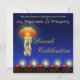 Happy Diwali illustration: A shiny Diwali lamp with red diyas (cup-shaped indian oil lamps) with an ornamental border on a night sky background.