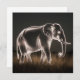 Luminous Elephant Silhouette, a photograph of a silhouette of a luminous elephant. The elephant's body is illuminated, with the light highlighting the majestic height of its trunk and the arch of its back. The elephant is standing in a field of tall grasses, which are also illuminated. The background is a solid black. The lighting creates a sense of grandeur.