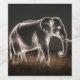 Luminous Elephant Silhouette, a photograph of a silhouette of a luminous elephant. The elephant's body is illuminated, with the light highlighting the majestic height of its trunk and the arch of its back. The elephant is standing in a field of tall grasses, which are also illuminated. The background is a solid black. The lighting creates a sense of grandeur.