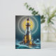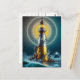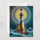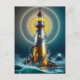 A golden lighthouse stands tall against a backdrop of swirling waves, illuminated by a radiant halo.