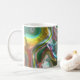 Turn every coffee break into a glowing art experience with this luminous liquid glass abstract mug. Waves of yellow, teal, green and magenta melt and swirl together like colored glass under light, creating hypnotic rings and flowing curves that draw the eye in.