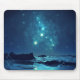 Scenic image of the icy north as seen at night. Shining stars and celestial forms can be seen twinkling overhead, glowing and luminous. They brighten the rocky terrain down below. Dark blue shadows are cast on the rocks and ice in the distance.