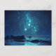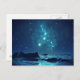 Scenic image of the icy north as seen at night. Shining stars and celestial forms can be seen twinkling overhead, glowing and luminous. They brighten the rocky terrain down below. Dark blue shadows are cast on the rocks and ice in the distance.