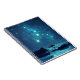 Scenic image of the icy north as seen at night. Shining stars and celestial forms can be seen twinkling overhead, glowing and luminous. They brighten the rocky terrain down below. Dark blue shadows are cast on the rocks and ice in the distance.