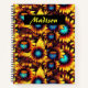 Keep your notes in this beautiful sunflower notebook. This luminous sunflower pattern of yellow, brown and turquoise will brighten up anyone's day. This notebook can be personalised with a name and would make a wonderful gift.