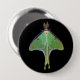 This button features the incredible luna moth, a lime-green, Nearctic Saturniid moth in the subfamily Saturniinae. With a wingspan of up to four and a half inches, this lovely creature ranks as one of the largest moths in North America. This adult moth has just emerged from the cocoon and is waiting on the bark of a tree trunk to dry and harden. The adults do not eat or have mouths. They live for only one week and emerge as adults only to mate. With lime green colour and distinctive eyespots this is a very mysterious, magical looking being.