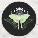 A vibrant green luna moth is surrounded by moon phases and lush green leaves against a deep black background.
