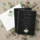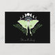 A vibrant green luna moth is surrounded by moon phases and lush green leaves against a deep black background.