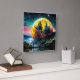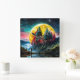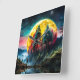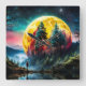 Large Colourful Moon Sets Down in the forest as a girl watches across a valley