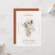 These trendy boho wedding invitations feature an abstract composition of various tropical botanicals - green palm leaves, pampas grass, flowers and ferns, and even faux gold accents. All appear on a soft neutral textured look background, with a terracotta rust colour on the back and a modern text layout.