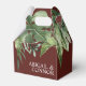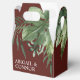 Elements: tropical greenery, tropical foliage, geometric frame, typography, serif font. Colours: green, bronze, dark red, brick Themes: modern, destination, beach, tropical, jungle, rainforest, botanical, coastal, contemporary, urban, boho chic, bohemian. Collection: Lush Exotic Tropical Palm Leaves Product Type: Favour Box - Gable