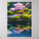 This digital artwork captures the beauty of a Japanese garden, complete with lush green bushes, vibrant flowers, and a serene still pond, all centred around a stunning sakura tree. The tranquil atmosphere and gorgeous colours make this piece perfect for creating a peaceful and calming space in your home.