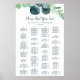 This lush greenery alphabetical seating chart poster is perfect for an elegant backyard wedding. This sign can be used to organize your guests alphabetically or by table number. The modern botanical design features gorgeous watercolor blue eucalyptus and green leaves. This wedding poster includes enough room for up to about 120 guests. Make room for more (or less) guests by clicking the "customize" button and decrease or increase the size of the font. In addition to the placement of each guest, personalize this sign with the names of the bride and groom and the wedding date.