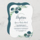 This lush greenery and eucalyptus baptism invitation is perfect for an elegant backyard event. The modern botanical design features gorgeous watercolor blue eucalyptus and green leaves.