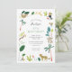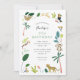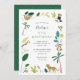 Whimsical party invitation featuring lush jungle plant life and animal illustrations including a tiger, parrot, sloth, monkey and snake.