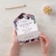 Watercolor flowers in shades of rich burgundy, gentle lilac, deep eggplant purple and pinkish orchid pair with modern green botanicals such as ferns and eucalyptus in these romantic, elegant boho wedding invitations. Featuring a clever, folding all-in-one design incorporating envelope, RSVP card and invitation in one.