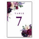 Watercolor flowers in shades of rich burgundy, gentle lilac, deep eggplant purple and pinkish orchid pair with modern green botanicals such as ferns and eucalyptus in these romantic, elegant boho table number cards.