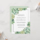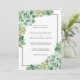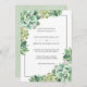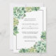 Modern wedding invitation surrounded by a frame with watercolor pastel green succulent bouquets on the left top corner and bottom right corner on a white background. Back is a green watercolor wash. Perfect for a spring or summer botanical or desert wedding. Coordinates with my wedding suite.