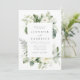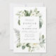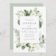 Elegant, botanical wedding invitation featuring your wedding details framed by painted white gardenia flowers, sprigs of baby's breath, sage green fern leaves, and vibrant green leaves. This white floral wedding invitation is perfect for garden weddings and spring or summer weddings.