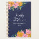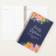 Beautiful floral planner or appointment book for you or your small business, with lush floral arrangement drawn in a modern style by hand on a tablet. The personalized spiral planner is dark blue with pretty pink and yellow flowers, and green and blue greenery. Personalize with your name in a thin signature script.