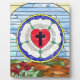 The Luther Rose's symbolism dates back to the 1520s. Luther explained that the red heart with the black cross represents the righteous living by faith in Christ the Crucified. The heart rests on a white rose, symbolising joy, comfort, and peace found through faith. The choice of white reflects the colour of heavenly spirits and angels. The white rose is set against a blue field, representing heaven, to signify that earthly joy and faith are just the beginning of eternal heavenly joy. Surrounding the blue field is a gold ring, symbolising the endless and precious happiness of heaven.