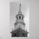 A photograph of the steeple of the Lutheran Church of the Holy Trinity in Lancaster, Pennsylvania. Constructed for one of the oldest Lutheran congregations in the country, this church is a fine example of a Georgian/Federal Church. The four statues of the Evangelists which decorate the steeple are particularly noteable features.