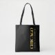 Lux women's tote bag features the city of Chicago's latitude and longitude map coordinates in gold fonts on black background