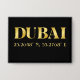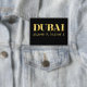 Collectable pinback button features Dubai, UAE latitude and longitude map coordinates in gold fonts on black background.