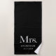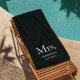 This elegant, minimalist beach towel says "Mrs." in a white, modern, high-fashion luxury font on black, and also has a spot for your last name and wedding date.