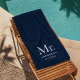 This elegant, minimalist beach towel for the mister says "Mr." in a white modern, high-fashion luxury font on dark navy blue, and also has a spot for your last name and wedding date.