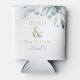 Full colour custom printed wedding favour can coolers personalised with the bride and groom's names or monogram, wedding date, location or other custom text. This elegant modern design features a faux gold foil ampersand with boho watercolor succulent greenery. Use the design tools to choose any fonts and colours you like, change the background colour or upload your own photos to design a unique one of a kind wedding keepsake for your guests or bridal party gifts.