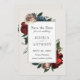A beautifully distinctive wedding Save the Date card that features luxurious floral elements framing your text on the front of the card, and a beautiful floral frame surrounding your photo on the back of the card. This design features mixed flowers including roses, peonies and other mixed stems in rich shades of red, burgundy, pink, blue and green. The background colour is a neutral ecru beige. Personalise with your details and add your desired photo in place of the sample photo on the back of the card.