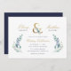 Affordable custom printed wedding invitations personalised with your event details. This elegant design features a faux gold foil ampersand with delicate blue and green watercolor florals on a white background. Use the design tools to customise the text, edit the fonts and colours or add your own photos to create a classy and stylish wedding invitation.